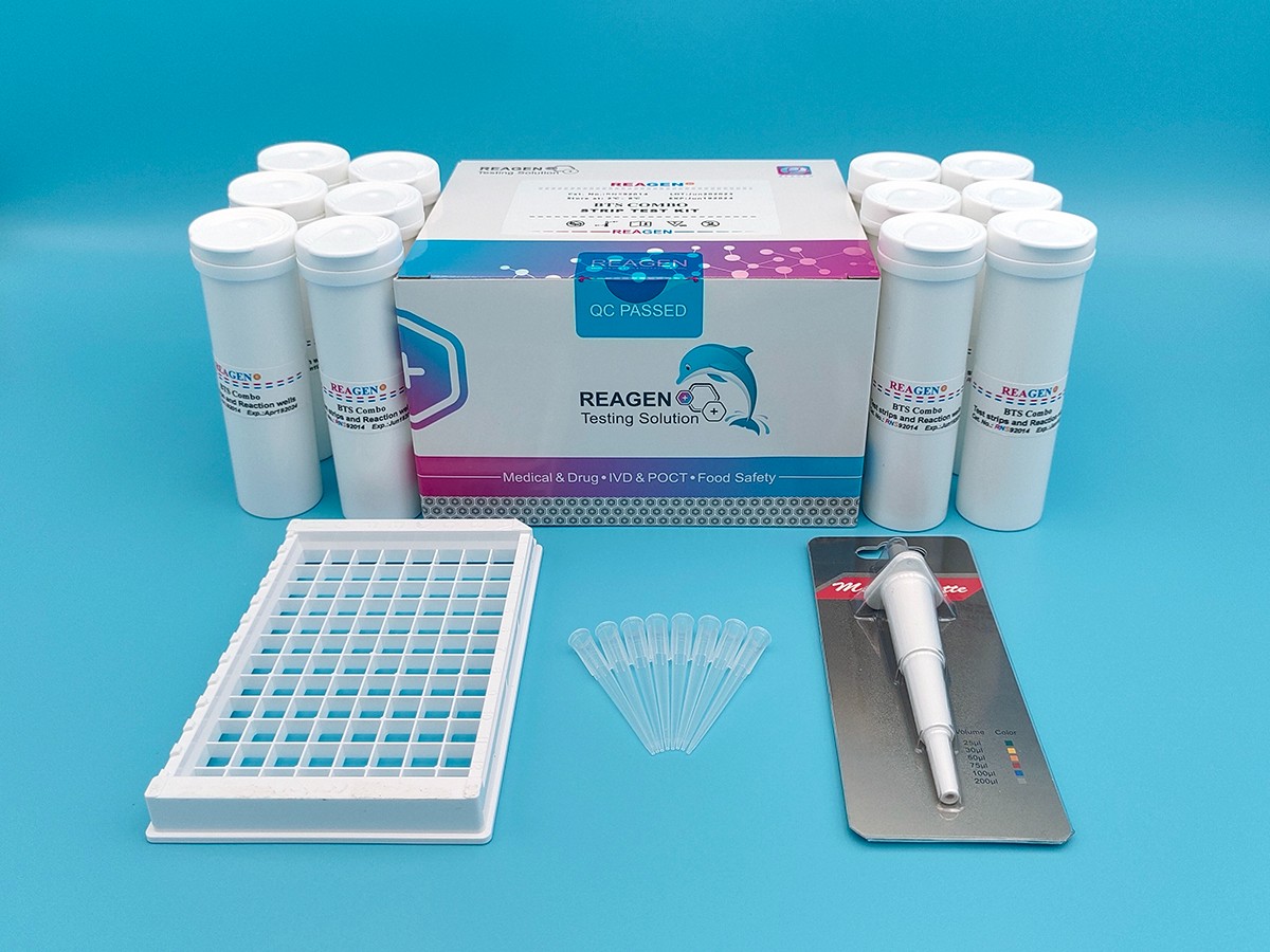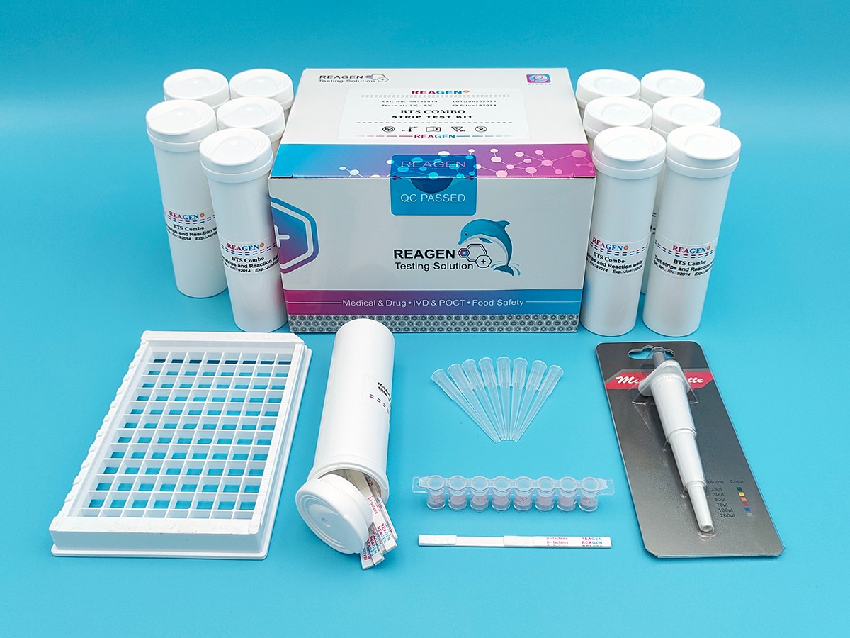 REAGEN?Beta-內(nèi)酰胺酶檢測試紙試劑盒檢測牛奶中Beta-內(nèi)酰胺酶。試劑供給政府機關(guān)、食品工廠和質(zhì)量監(jiān)督部門,用來檢測Beta-內(nèi)酰胺酶,靈敏度可低到0.8U/ml。試劑盒的特點: